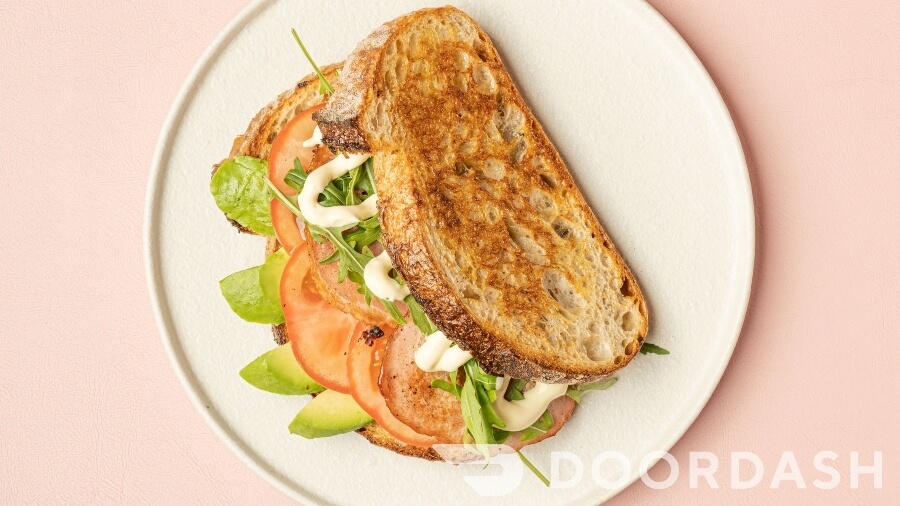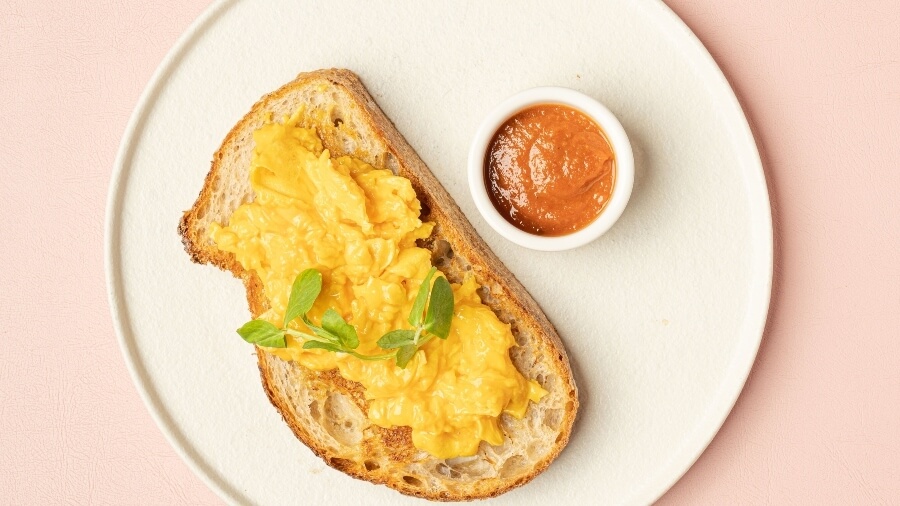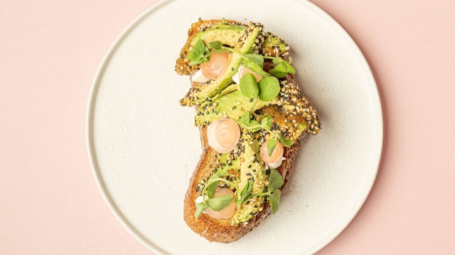 Avocado, lemon myrtle dukkha, lemon gel, labneh on 2 slices of house sourdough