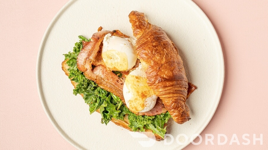 2 poached eggs, bacon, fermented chili hollandaise, seasonal greens, on house croissant